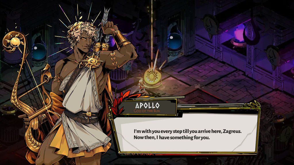 Zeus le regaló un carro de cisnes en el que partió al país de Hiperbóreos. Más tarde se fue a Delfos, donde mató a Pitón.